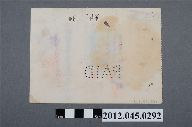 1.本物件為臺灣銀行發出之金額4,779圓支票,採橫式印刷。支票右側印有「小切手」3字,意即日文支票之意,3字上方蓋有1個印有「Aリ預」字樣的圓形章及1個「增補」二字章,3字左下方印有支配人、照印兩欄,欄內各蓋有1個紅色圓形章;小切手字樣左方留白,留白處上方印刷「金」字,金字下方由上而下以筆書寫「四仟七佰七拾九圓也」字樣。支票中央由上而下、自右而左印有「右金額此小切手引換ニ持參人ヘ御拂渡可被成候也」(意指右方金額可轉讓給支票持有人)、「昭和 年 月 日」、「振出地臺北州基隆市」等3行,其中,日期行覆印紫色「昭和拾九年拾月廿六日」字樣;振出地左方留白,留白處由上而下、自右而左蓋印「臺灣電化株式會社」、「取締役社長近藤銕次代理」、「基隆工場長水野敏行」,水野敏行名字下方蓋有篆體姓名圓形章,留白欄上方打有以圓洞構成的「¥4779.」字樣,下方處以圓洞構成「PAID」字樣;支票左方由上而下、自右而左印有「臺北州基隆市」、「株式會社臺灣銀行」等字,左方邊界處蓋有1個騎縫章;支票右上角印有「YK09538」編號,編號左上方再印有綠色「3」編號。支票背面空白。2.本物件為臺灣銀行發出的支票,臺灣銀行成立於1899年6月,是臺灣第一家現代銀行。