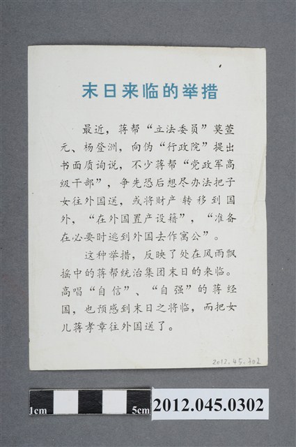2012.045.0302 「言與行、末日來臨的舉措」中國共產黨對臺灣政治宣傳單