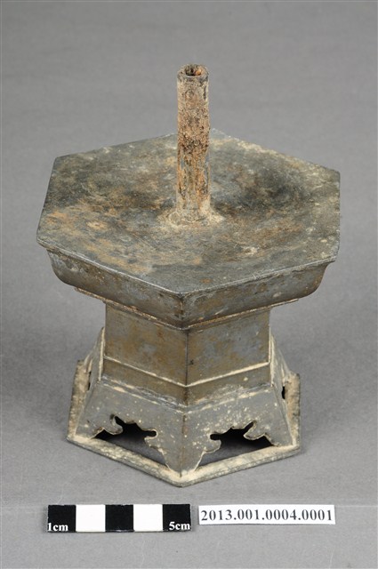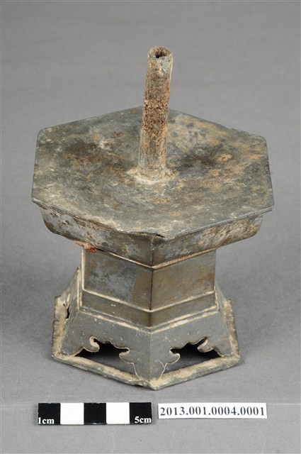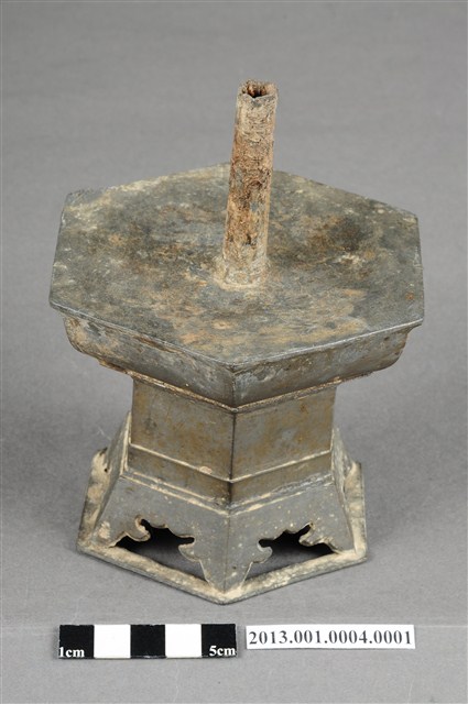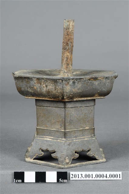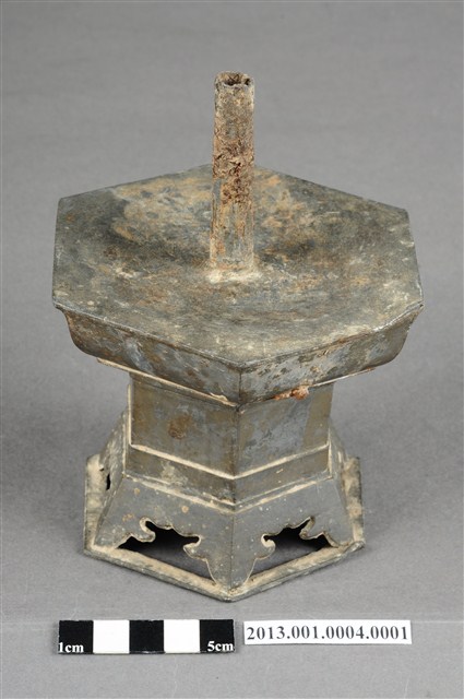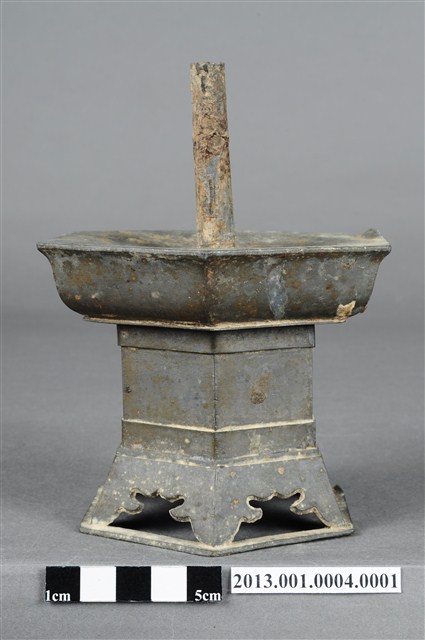 本對燭臺材質為錫造,作六角束腰盆體,尖足、帶拖泥,上部承一柱型燭插。物件原置於捐贈者位於台南山上鄉祖厝廳堂作使用。