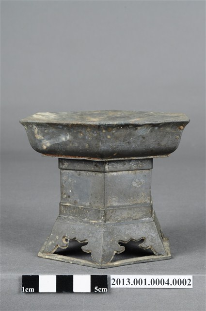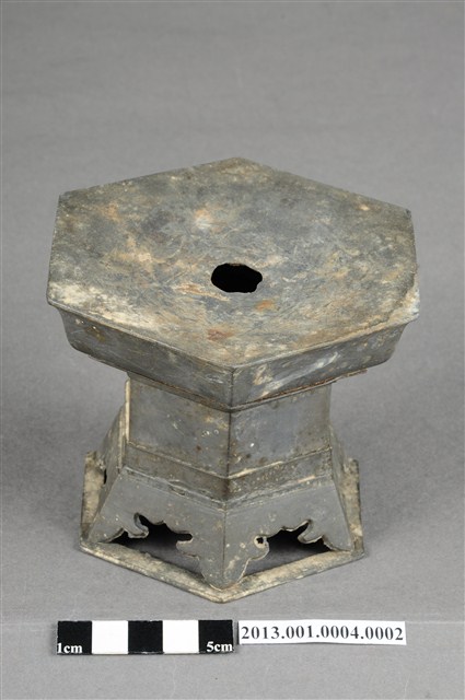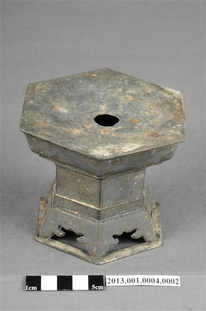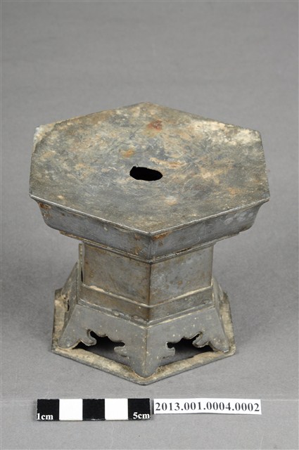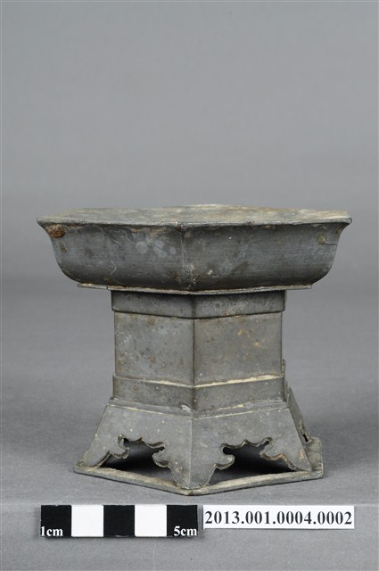 本對燭臺材質為錫造,作六角束腰盆體,尖足、帶拖泥,上部承一柱型燭插。本件燭插脫落,高度僅餘8.9公分。物件原置於捐贈者位於台南山上鄉祖厝廳堂作使用。
