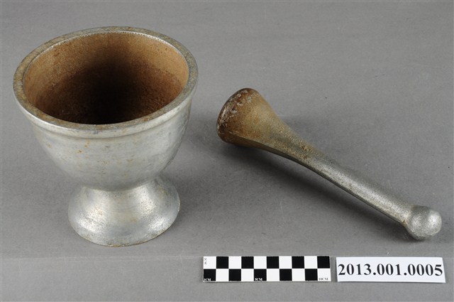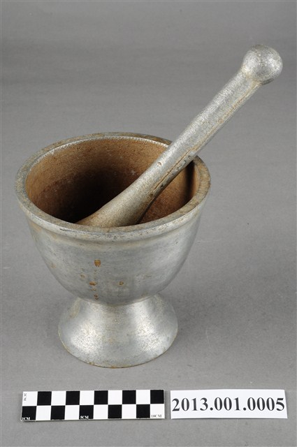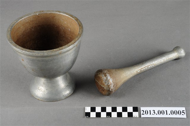 本件搗藥缽(又名研缽)為金屬製,材質應為鋁合金,質地堅硬,附磨壓用小杵(高21cm x 直徑5cm),用以將固體的藥物研磨成粉狀,是昔日普及於醫療場所的器具,亦適於家庭自用。