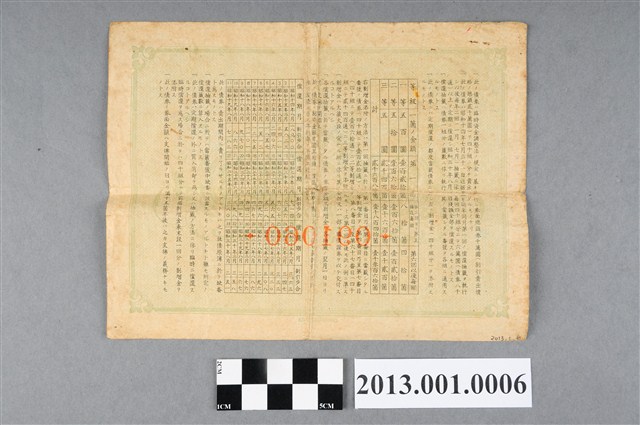 本件文物為日本勸業銀行在臺灣發行的債券,為因應「支那事件」爆發以來軍事需求,遂向民間發行貯蓄債券籌募需用經費。本件面額為「七圓五拾錢」,發行日期為昭和十四年四月,由李惠文女士父親所收藏。