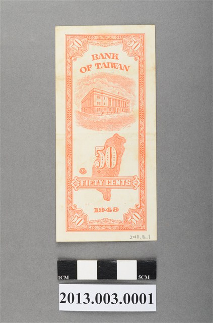 此為民國38年臺灣銀行開始製版發行的直式伍角紙鈔。正面圖案為國父像,背面圖案是臺銀總行及臺灣地圖。