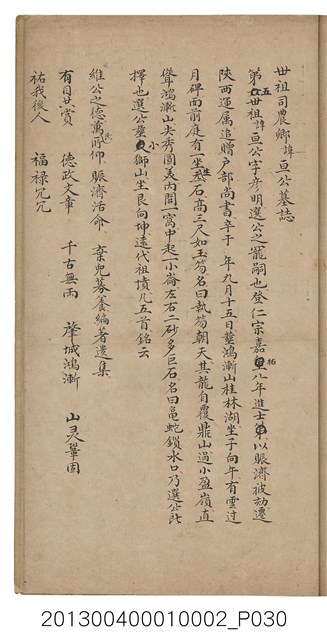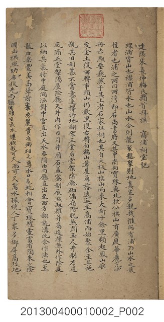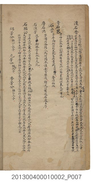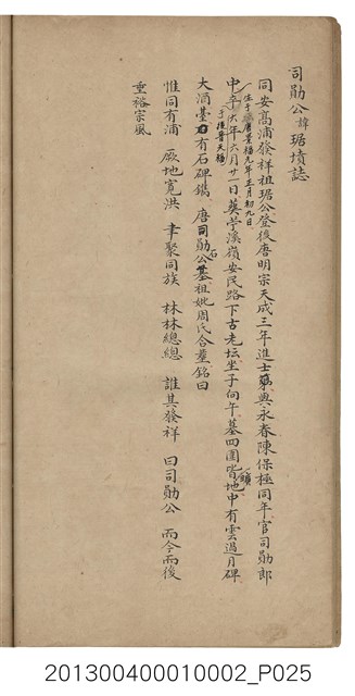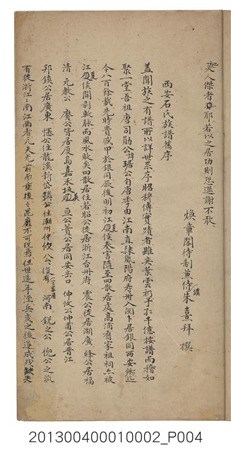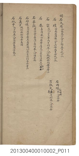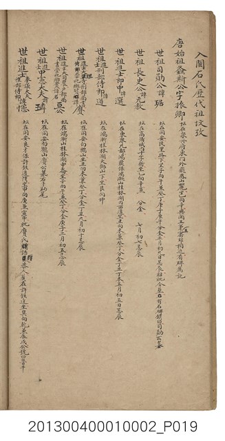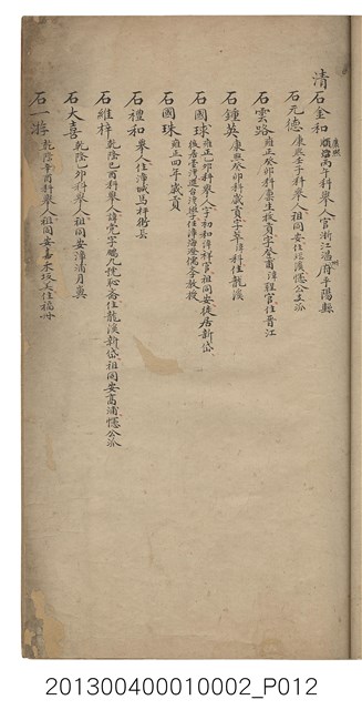此書以「祠墳考」為名,內容主要登載石氏從唐代入閩定居後,歷代祖先的祖墳位置。除文字外,並手繪有祖墳地圖。書中所載石氏先祖,上溯至東周衛國大夫石蜡、漢朝大夫石奮、晉朝富商石崇等中國歷史上的石姓名人。另外石氏入閩後的歷代先祖名人,也幾乎都是有功名的仕紳。其中記載一位遷居臺灣縣的石國球,為雍正乙卯科(雍正13年,1735年)舉人,後任漳州海澄縣教諭(教諭為縣儒學內教職,正八品文官)。這位石國球算是石氏早期遷居臺灣的仕紳名人。