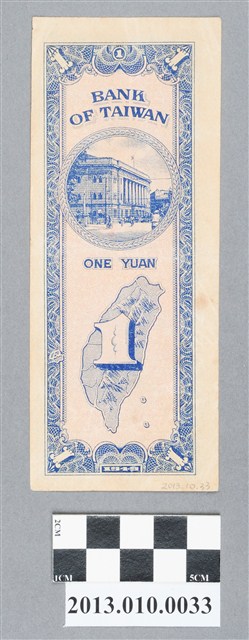 ,中華民國三十八年,臺灣銀行,背面為上為臺灣銀行,下為臺灣地圖上有1字樣,並有英文表示one yuan 及BANK OF TAIWAN。正面應為紅色,背面為藍色,捐贈者丁天降先生僅表明為藍色。