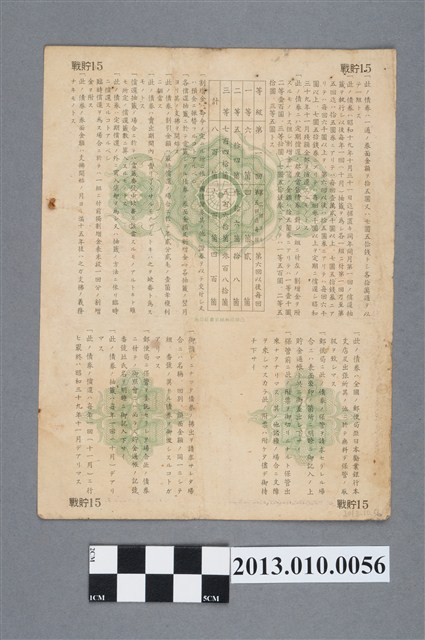 日本為籌措經費於1944年6月發行之第15回戰時儲蓄債券,這張有割增金(溢價金),這張原價15圓,以打折10圓出售。下有一式兩份之證券保管請求書。上有大東亞戰爭圖章