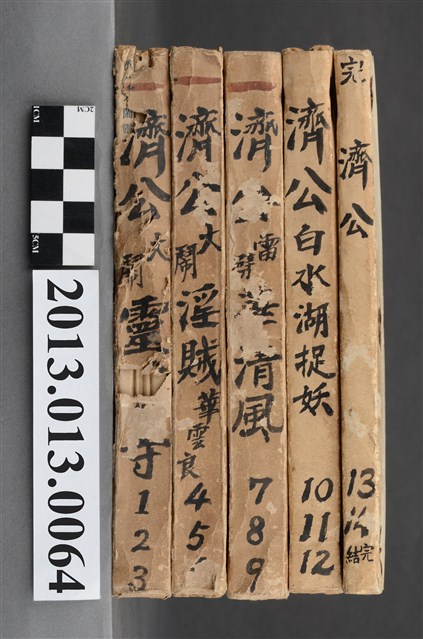 《濟公》系列漫畫叢刊共分五冊,每冊三集。內容以漢式人物繪漫畫方式描述濟公活佛的傳奇事蹟與冒險故事。由黃國樑主編,台北南華出版社發行,民國五十年七月出版。本件為第一冊〈大鬧靈隱寺〉,附書套,封面及內頁印有藏書章。