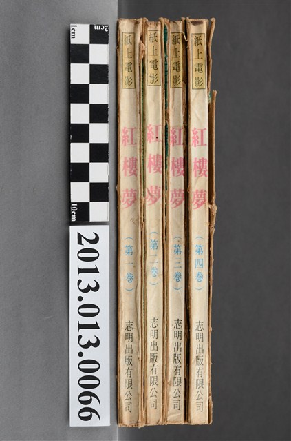 《紅樓夢》,為清代著名通俗小說,本款叢書共分四卷,以連續圖繪方式搭配文字說明呈現小說內容。民國六十七年元月一日,由台北市志明出版社出版發行。本件書冊及內頁印有「森豐書局」店章。