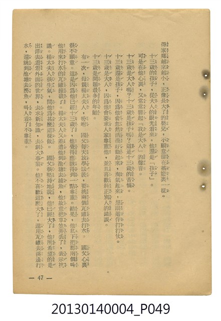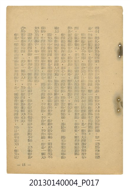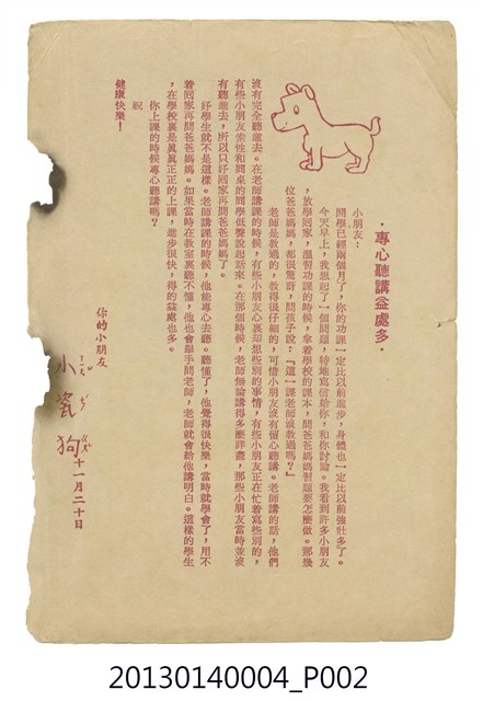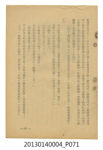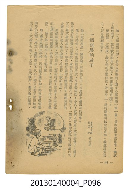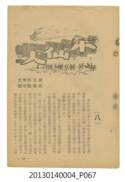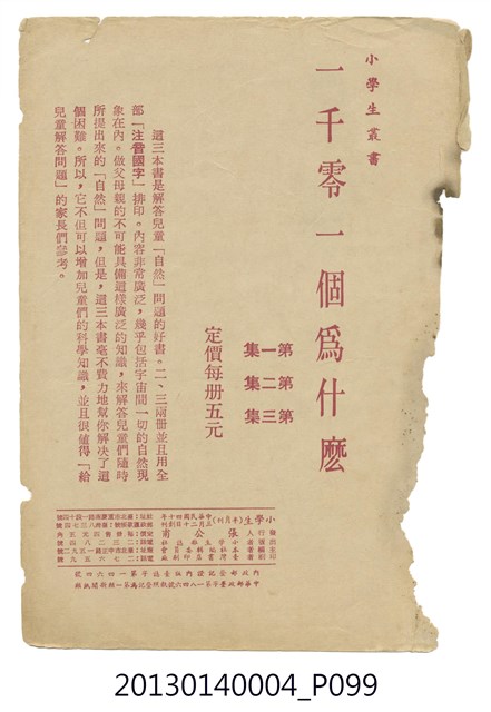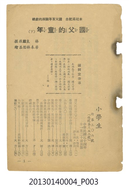 封面主題為孫中山兒童故事彩色插圖,註明「本社為紀念 國父百歲誕辰的禮獻」、「小學生雜誌社印行」。目次註明「民國54年11月20日出版」,內容除〈國父的童年(下)〉(林良 撰/廖未林 繪),還有〈台灣民間故事的介紹〉(蘇樺)等文章,共96頁單色印刷。封底有《阿輝的心》小說出版品彩印廣告。