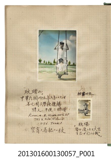 民國45年9月9日陳美惠與陳新平於善化國民學校前合照以及風景照共3張