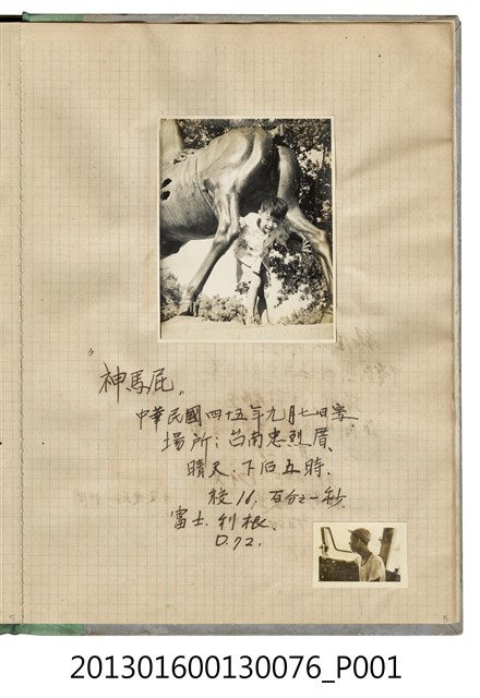 民國45年9月7日陳新平於神社銅馬前獨照2張