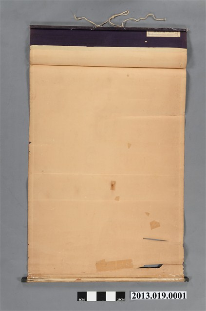1. 本件掛圖為慶應大學醫學部望月周三郎著人體內臟解剖掛圖,掛圖畫心為一印刷之人體內臟器官解剖圖像,裱褙於褐色布框內,掛圖上方曾被切割斷裂,以透明膠帶黏合,中央附有一棉質掛繩,掛圖底部下方則為黑色卷軸,不用時可將掛圖捲起收藏。