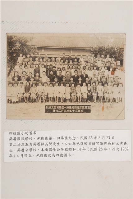 臺中縣立吳厝國民學校(1947年5月,改名四德國小,位於今臺中市霧峰區),戰後第一屆畢業紀念合照,民國35年3月27日。第二排左五為吳厝林其賢先生、左六為戰後首任官派鄉長林元吉先生。戰前為吳厝公學校,本屬霧峰公學校,昭和14年(1939年)4月獨立,1941年4月改稱吳厝國民學校。