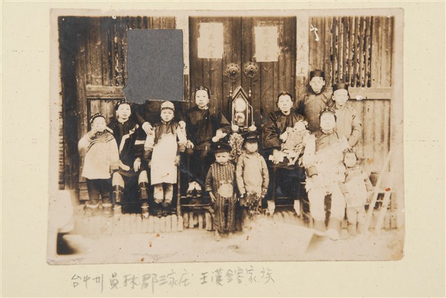 由照片內容來看推測為日治初期的照片,照片中的女性不分老少幾乎都有纏足。照片中央還有時鐘作為裝飾。原收藏者下方有臺中州員林郡三家庄王漢鎔家族合影,惟經評估者查詢員林郡無此街庄,僅有二水庄,推測為筆誤,更正之。