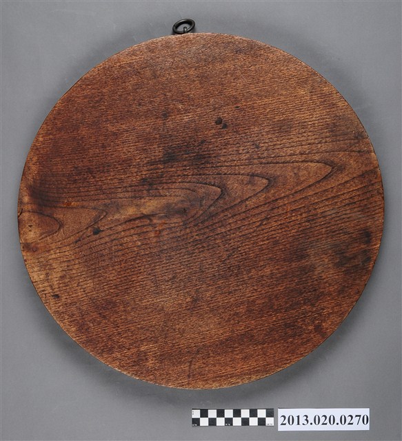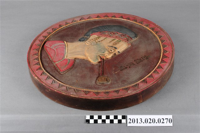 1.本件藏品為一件圓形木雕之泰雅風情招牌。刨削成圓盤形之木盤正面雕刻一位正以煙斗吸食煙草之原住民婦女側面,另以中文於一旁雕刻泰雅風情四字。臺灣原住民族吸食煙草之文化由來已久,本件以此作為其文化特色之一刻畫。此外,此婦女頭戴泰雅族中最具代表且文化意義為祖靈之眼的菱形織紋之頭飾,臉頰帶有紋面,木盤邊框亦雕刻一圈相連三角形紋,上述特徵皆為泰雅族之特色。此木盤上方釘有一個金屬圓環,便於懸掛擺飾。