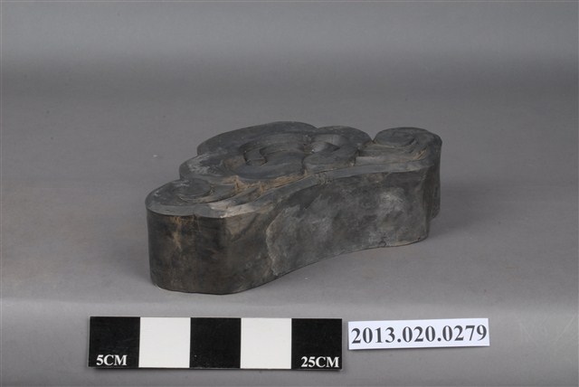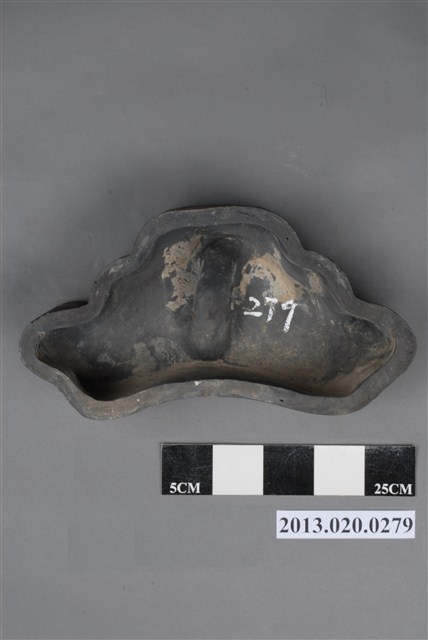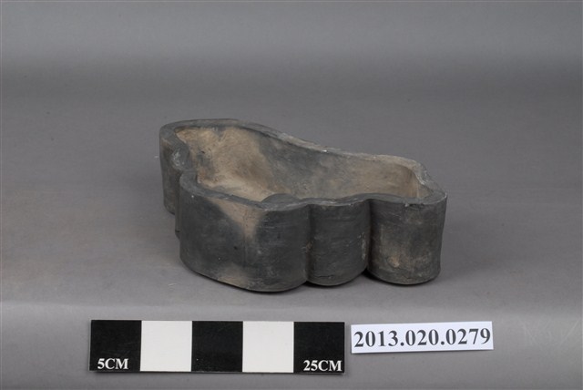 1.本藏品為黑陶鬼瓦,長34.5公分,寬9.1公分,高19.1公分,頭部呈現圓弧兩端向下收束至胴部,胴部下有回捲雲紋,形成分叉不甚明顯的兩足。整體以銳利的而回捲的線條刻畫而成,無其他裝飾,給人流暢銳利之感。2.鬼瓦為日本獸面瓦的統稱,這一類獸面瓦是東亞傳統建築上安裝在屋脊末端的構件,常裝飾以獸面紋,因其形象神似日本傳說中的鬼面,故在日本又有稱為鬼瓦、鬼板等名稱。臺灣因受日本殖民影響,在日治時期有許多建築採用日本瓦作,因此留存相當多的鬼瓦等日式裝飾瓦,甚至有本地陶瓷業者燒製這類瓦片。