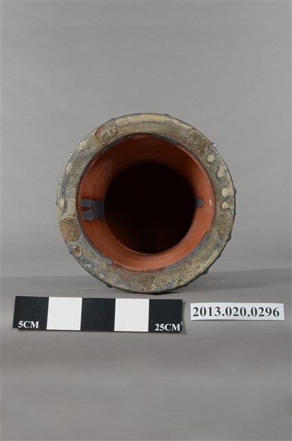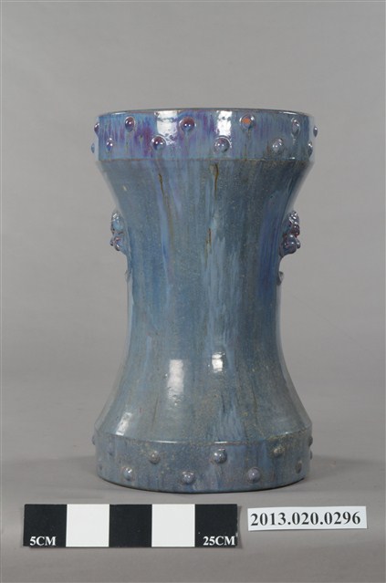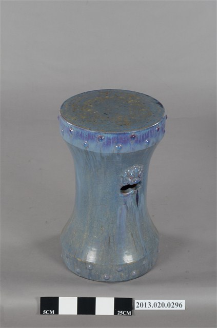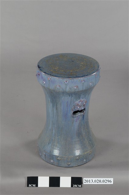 1. 本藏品為藍釉鼓凳,長29.5公分、寬29.5公分、高46.9公分,圓形的凳面側邊做有乳釘突起,器身做束腰,側面有獅頭開口,底足與凳面相似,同樣做有乳釘突出。整體而言仿照束腰皮鼓形式,並還原乳釘等特徵,通體施以藍釉,釉藥流淌、變色痕跡明顯,形成視覺特色。