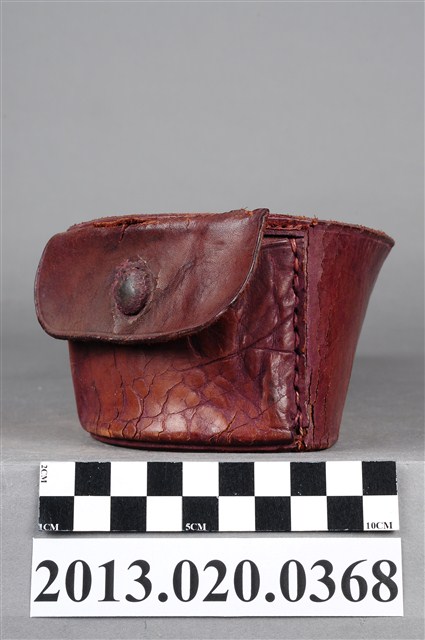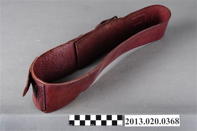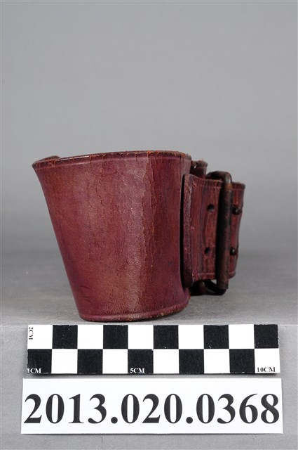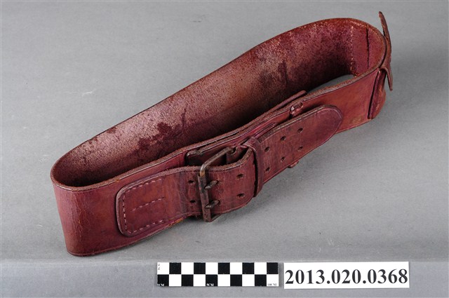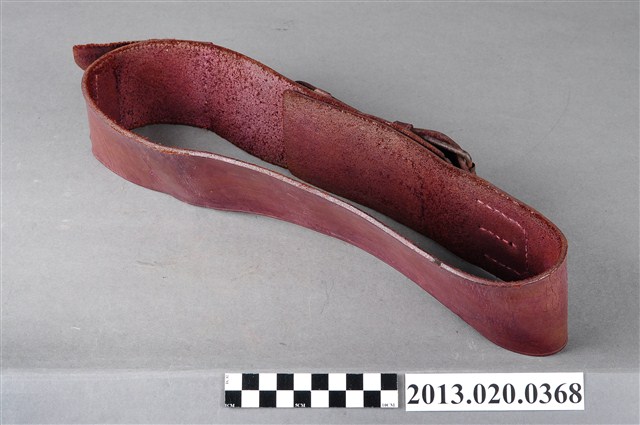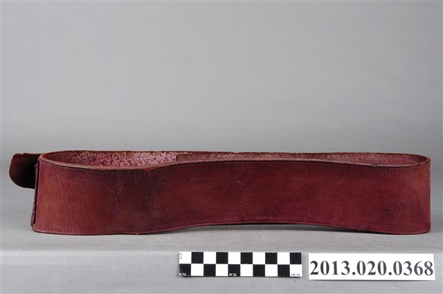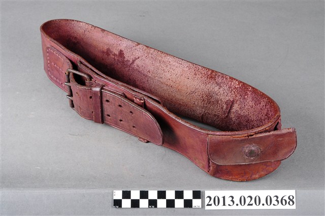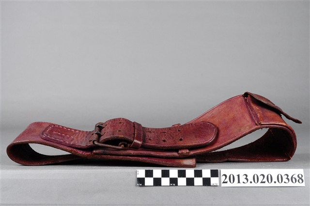 1.本件為牛皮製寬腰帶,棕紅色,雙排釦設計,銅製環扣,皮帶外側約略左腰側處,以相同皮料縫製一個含暗扣蓋的置物小袋,皮質厚實,堅固耐用,推測應屬武裝帶組合中的腰帶部分。2. 武裝帶於二戰時期常見於日軍軍官的軍服配備中,通常繫於軍服之外,武裝帶包含三個部分,一是寬皮腰帶,二是右肩左斜的窄皮帶,三是掛軍刀或短劍用的刀帶;武裝帶的腰帶部分通常是雙排扣設計,腰帶上可另外吊掛槍套及子彈匣。