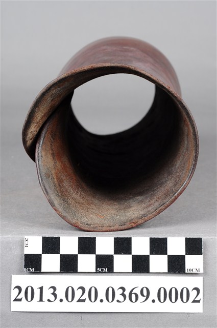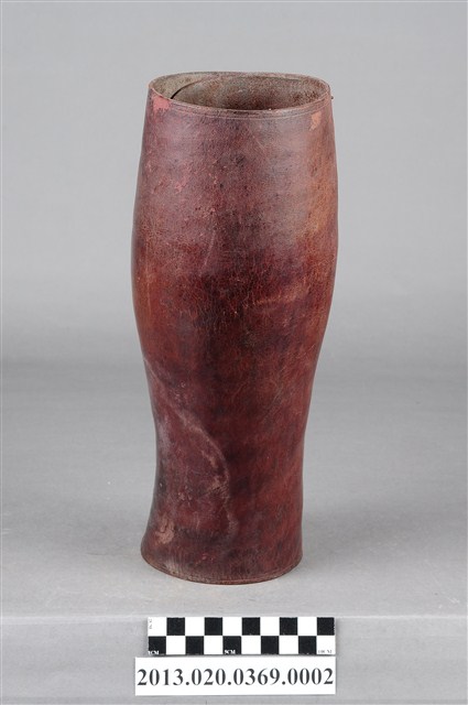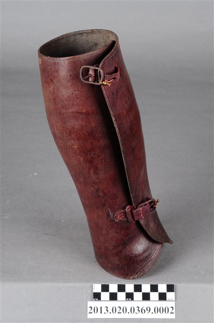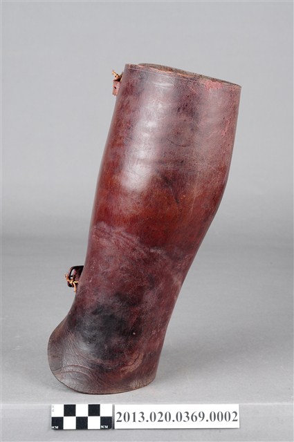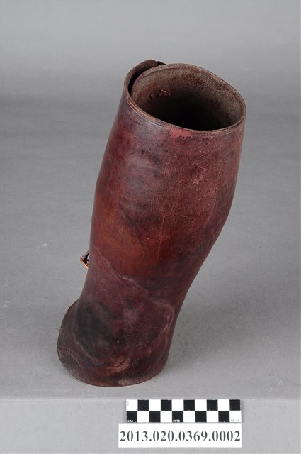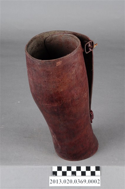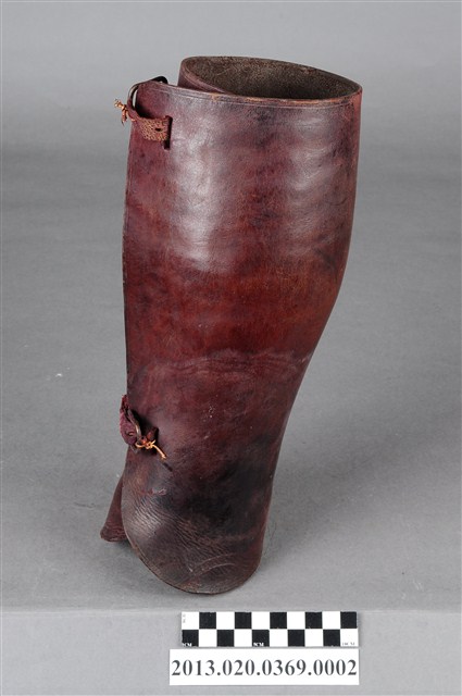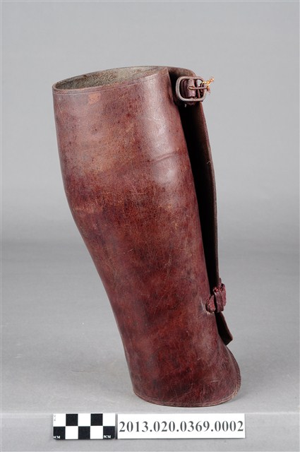1.本件為皮綁腿的右腿,全牛皮製作,沿著小腿做成硬挺的小腿肚形狀,使用時將其包覆整個小腿,皮革邊緣分別有皮製繫帶及金屬環扣,用來固定及調整大小。繫帶與環扣的設計改善了傳統帶狀綁腿布穿脫耗時的缺點。2.打綁腿可以避免長時間過度運動而產生的腫漲,以及跨越障礙時保護腳部不易受傷。二戰時日軍軍官使用棕色皮綁腿,海軍軍官使用黑色皮綁腿,士兵則使用一般綁腿布。