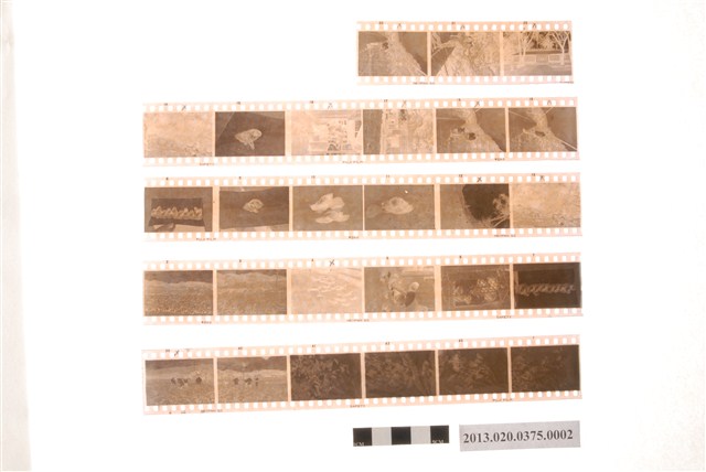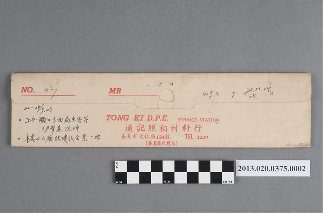 病蟲害、人物與處辦公廳等黑白底片,為阿里山林管局底片60封之2,包含紙封套與底片二部分。紙封套呈扁長方形,表面作紅色彩色印刷,封面印有「Camera & D.P.E.」與「T.K」等英文字樣,右側印「照相材料」四字,封底上方印有「NO.」、「MR」與「年、月、日」等字,下方印有「TONG-KI D.P.E. SERVICE STATION」和「通記照相材料行」之商家中英文字樣,以及地址與電話,並以手寫標註編號「57」,日期「49年9月22、23、24、25日」,以及「22-25/9.49玉井、觸口方面病蟲害等」、「尹肇基、沈坤」、「本處辦公廳改建後全景一張」等影像內容資訊。封套採三段摺疊方式開闔,內側下半部黏有一層薄膜,用來保護底片,將底片放入後向上摺起以訂書針固定,呈信封狀,開口頂端作一半圓形凸出與一半圓形切口,下摺後可插入下半部中央的U形切口固定。底片共有5段,每段包含3至6張影像不等,主題為動植物、人物與建築。