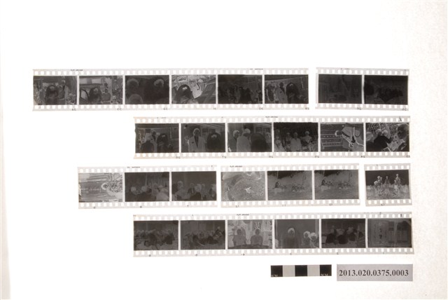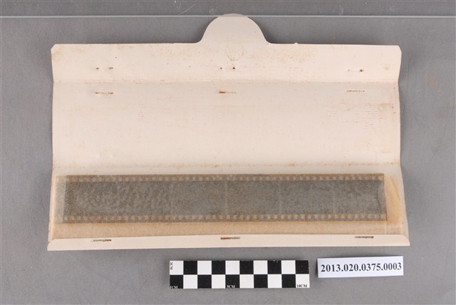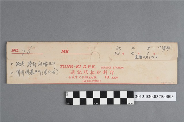 婚禮與掃墓黑白底片,為阿里山林管局底片60封之3,包含紙封套與底片二部分。紙封套呈扁長方形,表面作紅色彩色印刷,封面印有「Camera & D.P.E.」與「T.K」等英文字樣,右側印「照相材料」四字,封底上方印有「NO.」、「MR」與「年、月、日」等字,下方印有「TONG-KI D.P.E. SERVICE STATION」和「通記照相材料行」之商家中英文字樣,以及地址與電話,並以手寫標註編號「76」,日期「50年4月1日舊曆二月十六日、50年4月5日(清明)」,以及「淑美、勝祈結婚照片」、「清明掃墓照片(家父、母)」等影像內容資訊。封套採三段摺疊方式開闔,內側下半部黏有一層薄膜,用來保護底片,將底片放入後向上摺起以訂書針固定,呈信封狀,開口頂端作一半圓形凸出與一半圓形切口,右側略有撕裂破損痕跡,下摺後可插入下半部中央的U形切口固定。底片共有7段,每段包含1至6張影像不等,影像1至9與影像23至36主題為嫁娶儀式,影像10至13為掃墓場景。