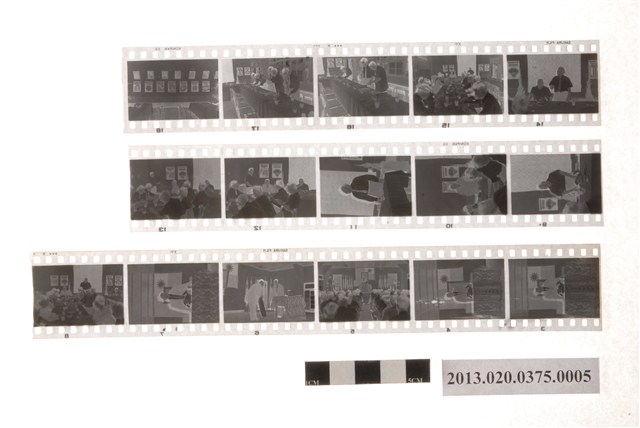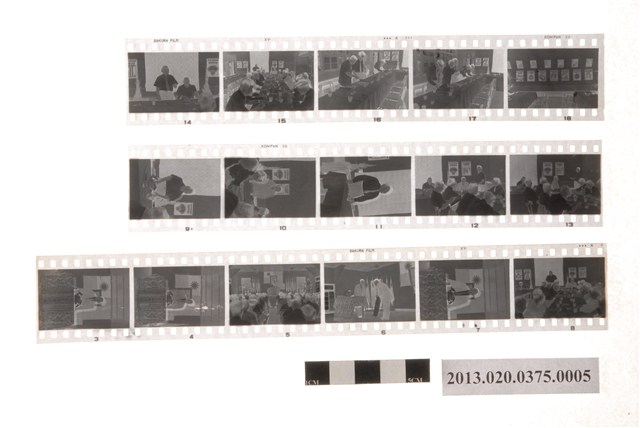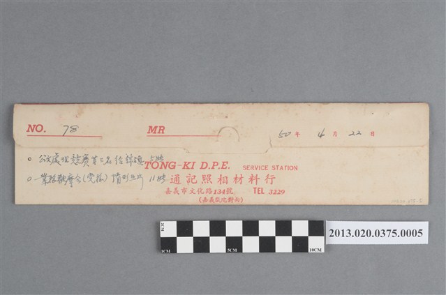 公文處理競賽頒獎與業務觀摩會黑白底片,為阿里山林管局底片60封之5,包含紙封套與底片二部分。紙封套呈扁長方形,表面作紅色彩色印刷,封面印有「Camera & D.P.E.」與「T.K」等英文字樣,右側印「照相材料」四字,封底上方印有「NO.」、「MR」與「年、月、日」等字,下方印有「TONG-KI D.P.E. SERVICE STATION」和「通記照相材料行」之商家中英文字樣,以及地址與電話,並以手寫標註編號「78」,日期「50年4月22日」,以及「公文處理競賽第三名給錦旗五張」、「業務觀摩會(黨務)情形照片11張」等影像內容資訊。封套採三段摺疊方式開闔,內側下半部黏有一層薄膜,用來保護底片,將底片放入後向上摺起以訂書針固定,呈信封狀,開口頂端作一半圓形凸出與一半圓形切口,右側略有撕裂破損痕跡,下摺後可插入下半部中央的U形切口固定。底片共有3段,每段包含5至6張影像不等,主題為頒獎與會議活動記錄。