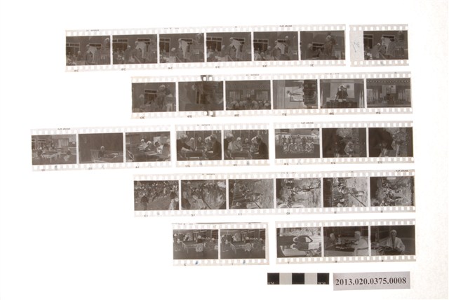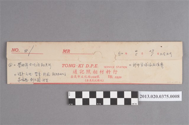 勞動節各項活動黑白底片,為阿里山林管局底片60封之8,包含紙封套與底片二部分。紙封套呈扁長方形,略泛黃,表面作紅色彩色印刷,封面印有「Camera & D.P.E.」與「T.K」等英文字樣,右側印「照相材料」四字,封底上方印有「NO.」、「MR」與「年、月、日」等字,下方印有「TONG-KI D.P.E. SERVICE STATION」和「通記照相材料行」之商家中英文字樣,以及地址與電話,並以手寫標註編號「81」,日期「50年4月29日、5月1日大會照片」,以及「勞動節各項活動照片」、「俊彥、文□、瑩華、彩鳳、柯太太及公主、莊愧成、劉光國新賀」、「新升籃球隊友誼賽」等影像內容資訊。封套採三段摺疊方式開闔,內側下半部黏有一層薄膜,用來保護底片,將底片放入後向上摺起以訂書針固定,呈信封狀,開口頂端作一半圓形凸出與一半圓形切口,左右側略有撕裂破損痕跡,下摺後可插入下半部中央的U形切口固定。底片共有5段,每段包含4至6張影像不等,主題為勞動節活動記錄。