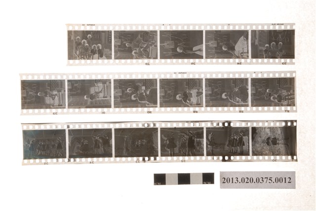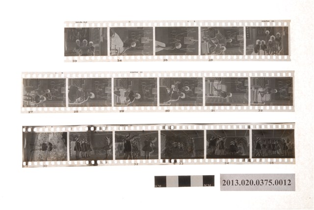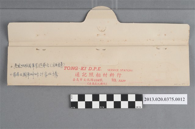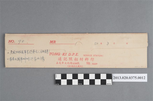 吳鳳幼稚園畢業遊藝會與人物黑白底片,為阿里山林管局底片60封之12,包含紙封套與底片二部分。紙封套呈扁長方形,表面作紅色彩色印刷,封面印有「Camera & D.P.E.」與「T.K」等英文字樣,右側印「照相材料」四字,封底上方印有「NO.」、「MR」與「年、月、日」等字,下方印有「TONG-KI D.P.E. SERVICE STATION」和「通記照相材料行」之商家中英文字樣,以及地址與電話,並以手寫標註編號「90」,日期「50年8月」,以及「吳鳳幼稚園畢業遊藝會(宗成惠青)」、「家屬及國華姊妹於家內攝」等影像內容資訊。封套採三段摺疊方式開闔,內側下半部黏有一層薄膜,用來保護底片,將底片放入後向上摺起以訂書針固定,呈信封狀,開口頂端作一半圓形凸出與一半圓形切口,下摺後可插入下半部中央的U形切口固定。底片共有4段,每段包含5至6張影像不等,主題為活動記錄與人物。