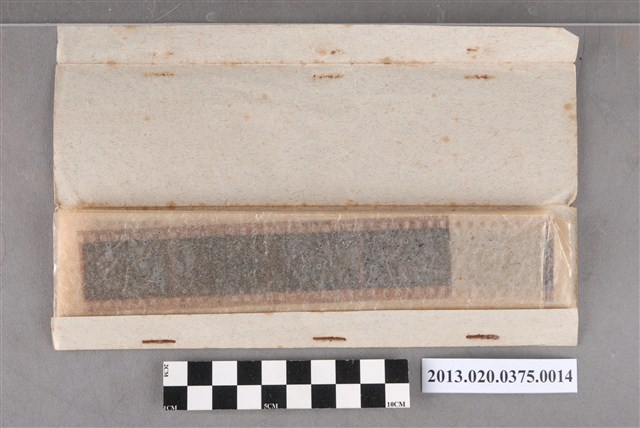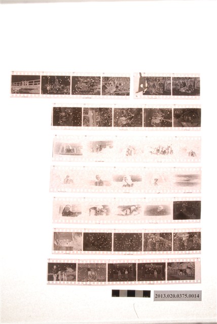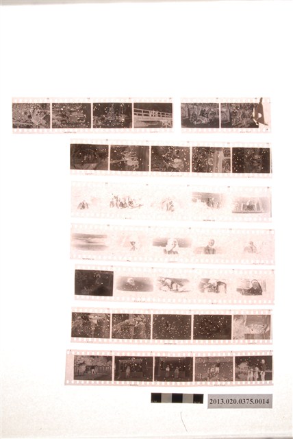 電影伉儷情深、鷲與鷹及人物風景等黑白底片,為阿里山林管局底片60封之14,包含紙封套與底片二部分。紙封套呈扁長方形,帶有些許黃褐色斑點,表面作黑色印刷,封面左側印有「NO.」、「MR.」、「微粒沖片」、「精工放大」、「交件迅速」、「器材買賣」等字,右側印有「通記照相材料行 TONG-KI PHOTO SUPPLIES CO.,」及地址之中英文字樣,並以手寫標註編號「1」,日期「48.1.18前後攝」,以及「伉儷情深、鷲と鷹電影,石原裕二郎、淺丘ルリ子」、「惠英等四在貯木地及公園」等影像內容資訊。封套採四段摺疊方式開闔,內側下半部帶有一層薄膜,用來保護底片,將底片放入後把封套下端上摺以訂書針固定,再向上摺起包覆底片,呈信封狀,最後將開口頂端下摺。底片共有8段,上有白色斑點,每段包含2至5張影像不等,主題為電影場景、人物與風景。