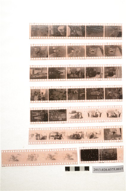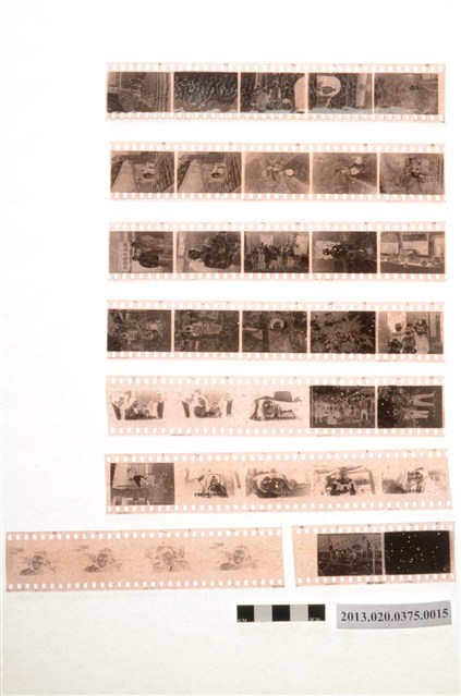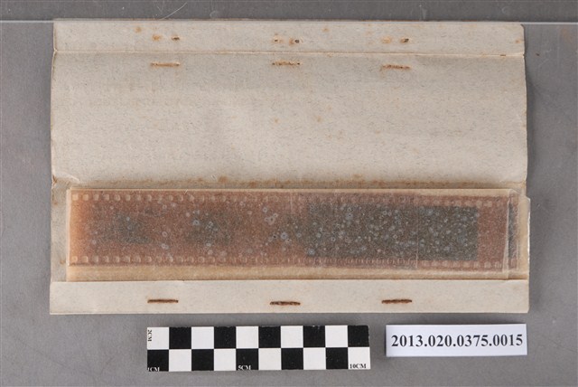 電影戰國佳人及春節黑白底片之一,為阿里山林管局底片60封之15,包含紙封套與底片二部分。紙封套呈扁長方形,帶有些許黃褐色斑點,表面作黑色印刷,封面左側印有「NO.」、「MR.」、「微粒沖片」、「精工放大」、「交件迅速」、「器材買賣」等字,右側印有「通記照相材料行 TONG-KI PHOTO SUPPLIES CO.,」及地址之中英文字樣,並以手寫標註編號「2」,日期「48.2.8前後攝」,以及「48年春節照片1」、「電影『戰國佳人』」、「獅頭山」等影像內容資訊。封套採四段摺疊方式開闔,內側下半部帶有一層薄膜,用來保護底片,將底片放入後把封套下端上摺以訂書針固定,再向上摺起包覆底片,呈信封狀,最後將開口頂端下摺。底片共有8段,上有白色斑點,每段包含2至5張影像不等,主題為電影場景、春節期間家族人物及出遊生活照。