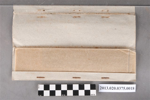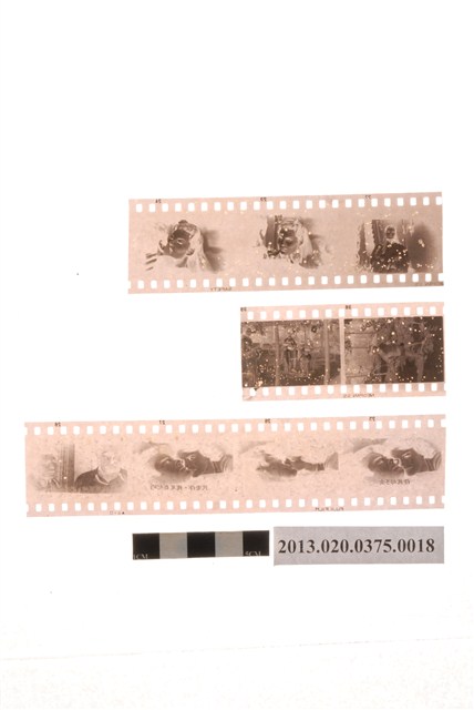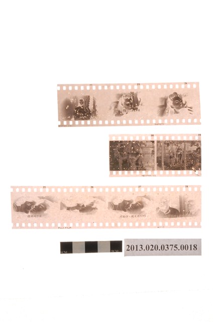 電影血劍狐忠、養子不教誰之過等黑白底片,為阿里山林管局底片60封之18,包含紙封套與底片二部分。紙封套呈扁長方形,帶有些許黃褐色斑點,表面作黑色印刷,封面左側印有「NO.」、「MR.」、「微粒沖片」、「精工放大」、「交件迅速」、「器材買賣」等字,右側印有「通記照相材料行 TONG-KI PHOTO SUPPLIES CO.,」及地址之中英文字樣,並以手寫標註編號「5」,日期「48.二月底及三月初」,以及「電影『血劍狐忠』『養子不教誰之過』」、「落蒼試照二張(碩良等)」等影像內容資訊,第二行文字被劃線刪除。封套採四段摺疊方式開闔,內側下半部帶有一層薄膜,用來保護底片,將底片放入後把封套下端上摺以訂書針固定,再向上摺起包覆底片,呈信封狀,最後將開口頂端下摺。底片共有3段,上有白色斑點,每段包含2至4張影像不等,主題為電影場景、人物。
