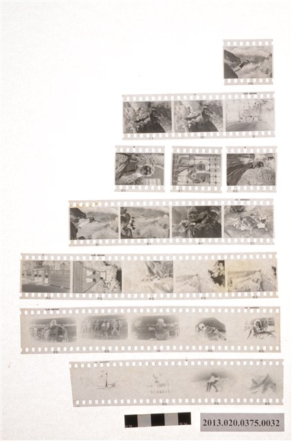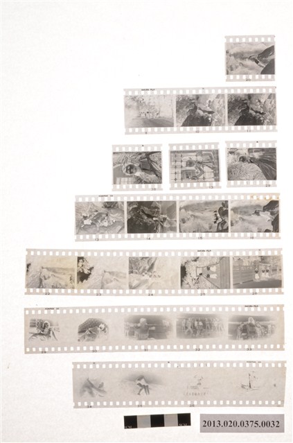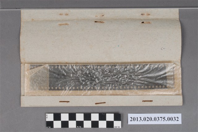 觀音瀑布、電影禁海黑珍珠與人物等黑白底片,為阿里山林管局底片60封之32,包含紙封套與底片二部分。紙封套呈扁長方形,表面作黑色印刷,封面左側印有「NO.」、「MR.」、「微粒沖片」、「精工放大」、「交件迅速」、「器材買賣」等字,右側印有「通記照相材料行 TONG-KI PHOTO SUPPLIES CO.,」及地址之中英文字樣,並以手寫標註編號「26」,以及「48.11.1遊觀音瀑布(禁海黑珍珠電影)」、「48.10.18麗瑾於林試所三張」等影像內容資訊。封套採四段摺疊方式開闔,內側下半部帶有一層薄膜,用來保護底片,將底片放入後把封套下端上摺以訂書針固定,再向上摺起包覆底片,呈信封狀,最後將開口頂端下摺。底片共有9段,每段包含1至5張影像不等,主題為出遊生活照、點影場景與人物。