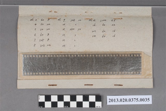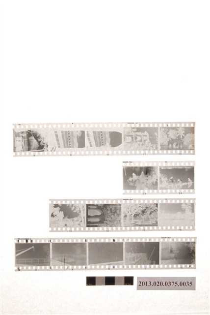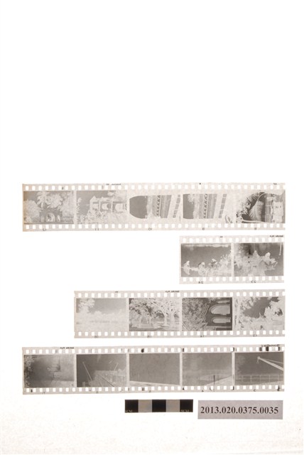 阿里山林場晨曦與風景黑白底片,為阿里山林管局底片60封之35,包含紙封套與底片二部分。紙封套呈扁長方形,表面作黑色印刷,封面左側印有「NO.」、「MR.」、「微粒沖片」、「精工放大」、「交件迅速」、「器材買賣」等字,右側印有「通記照相材料行 TONG-KI PHOTO SUPPLIES CO.,」及地址之中英文字樣,並以手寫標註編號「29」,日期「48.11.22~28間」,以及「林場晨曦」、「彌陀寺、崇靈塔風景」、「吳鳳廟等風景」等影像內容資訊,紙封套內側手寫一連串編號與數字,可能為攝影時的光圈、快門等數據記錄。封套採四段摺疊方式開闔,內側下半部帶有一層薄膜,用來保護底片,將底片放入後把封套下端上摺以訂書針固定,再向上摺起包覆底片,呈信封狀,最後將開口頂端下摺。底片共有4段,每段包含2至5張影像不等,主題為風景與建築。