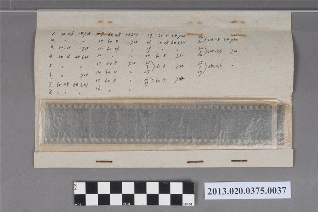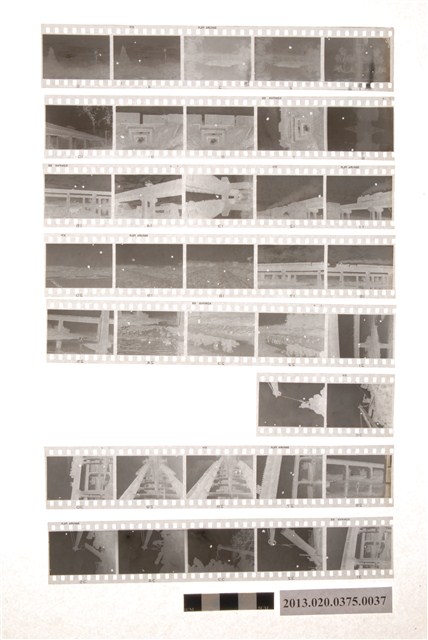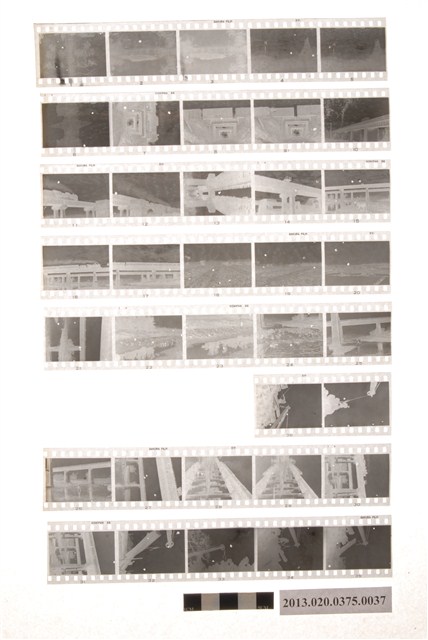 阿里山林場風景黑白底片,為阿里山林管局底片60封之37,包含紙封套與底片二部分。紙封套呈扁長方形,表面作黑色印刷,封面左側印有「NO.」、「MR.」、「微粒沖片」、「精工放大」、「交件迅速」、「器材買賣」等字,右側印有「通記照相材料行 TONG-KI PHOTO SUPPLIES CO.,」及地址之中英文字樣,並以手寫標註編號「31」,日期「48.12.2起、48.12.6止」,以及「風景照片」、「林場、牛稠溪、鐵路、公路、農場等」等影像內容資訊,紙封套內側手寫一連串編號與數字,為攝影時的光圈、快門、時間等數據記錄。封套採四段摺疊方式開闔,內側下半部帶有一層薄膜,用來保護底片,將底片放入後把封套下端上摺以訂書針固定,再向上摺起包覆底片,呈信封狀,最後將開口頂端下摺。底片共有8段,上有白色斑點,每段包含2至5張影像不等,主題為阿里山林場風景與林業鐵路。