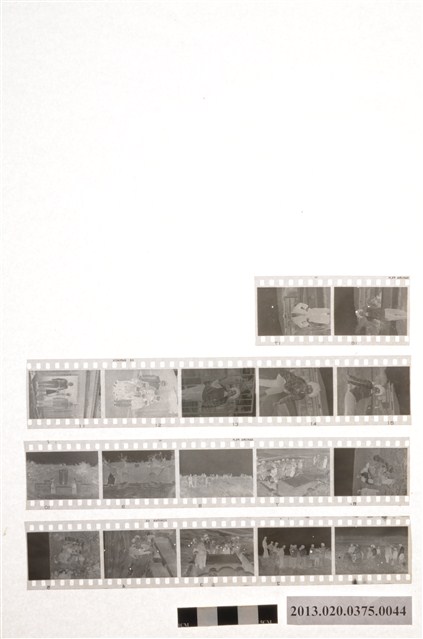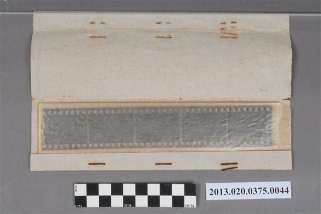 掃墓與春節全家福黑白底片,為阿里山林管局底片60封之44,包含紙封套與底片二部分。紙封套呈扁長方形,表面作黑色印刷,封面左側印有「NO.」、「MR.」、「微粒沖片」、「精工放大」、「交件迅速」、「器材買賣」等字,右側印有「通記照相材料行 TONG-KI PHOTO SUPPLIES CO.,」及地址之中英文字樣,並以手寫標註編號「38」,日期「49.1.29」,以及「秋林回來掃墓照片」、「簡光輝、黃仁義春節全家福」、「春節與蒼攝於原蔴處」等影像內容資訊。封套採四段摺疊方式開闔,內側下半部帶有一層薄膜,用來保護底片,將底片放入後把封套下端上摺以訂書針固定,再向上摺起包覆底片,呈信封狀,最後將開口頂端下摺。底片共有4段,每段包含2至5張影像不等,主題為掃墓場景與人物。