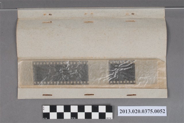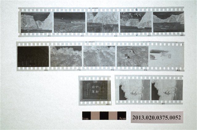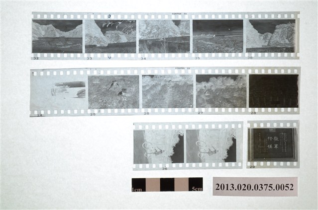 敬軍楷模獎狀、苗圃、攔沙壩工程等黑白底片,為阿里山林管局底片60封之52,包含紙封套與底片二部分。紙封套呈扁長方形,表面作黑色印刷,封面左側印有「NO.」、「MR.」、「微粒沖片」、「精工放大」、「交件迅速」、「器材買賣」等字,右側印有「通記照相材料行 TONG-KI PHOTO SUPPLIES CO.,」及地址之中英文字樣,並以手寫標註編號「51」,日期「49.6.23.24」,以及「敬軍楷模獎狀」、「嘉義苗圃作業情形」、「林區內工作站清水溪攔沙壩工程」、「6月26麗璟奇車」等影像內容資訊。封套採四段摺疊方式開闔,內側下半部帶有一層薄膜,用來保護底片,將底片放入後把封套下端上摺以訂書針固定,再向上摺起包覆底片,呈信封狀,最後將開口頂端下摺。底片共有4段,每段包含1至5張影像不等,主題以林區作業情形為主,影像29為敬軍楷模獎狀,影像36、37為麗瑾騎車,依編號判定這二張影像可能來自另一卷底片。