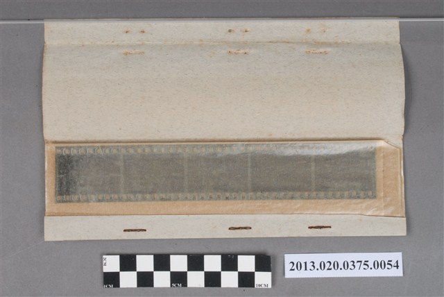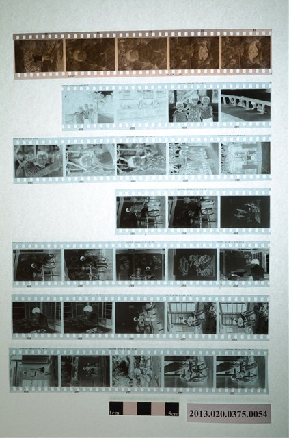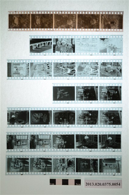 處長太太於辦公廳及公館與孩童於中山公園黑白底片,為阿里山林管局底片60封之54,包含紙封套與底片二部分。紙封套呈扁長方形,表面作黑色印刷,封面左側印有「NO.」、「MR.」、「微粒沖片」、「精工放大」、「交件迅速」、「器材買賣」等字,右側印有「通記照相材料行 TONG-KI PHOTO SUPPLIES CO.,」及地址之中英文字樣,並以手寫標註編號「53」,日期「49.7.2.3」,以及「處長太太於辦公廳及公館」、「麗璟、碩良、宗成等於中山公園」等影像內容資訊。封套採四段摺疊方式開闔,內側下半部帶有一層薄膜,用來保護底片,將底片放入後把封套下端上摺以訂書針固定,再向上摺起包覆底片,呈信封狀,最後將開口頂端下摺。底片共有7段,分別來自二卷不同底片,最上面一段底片呈褐色調,其餘底片呈黑白色調,每段包含3至5張影像不等,主題為人物。