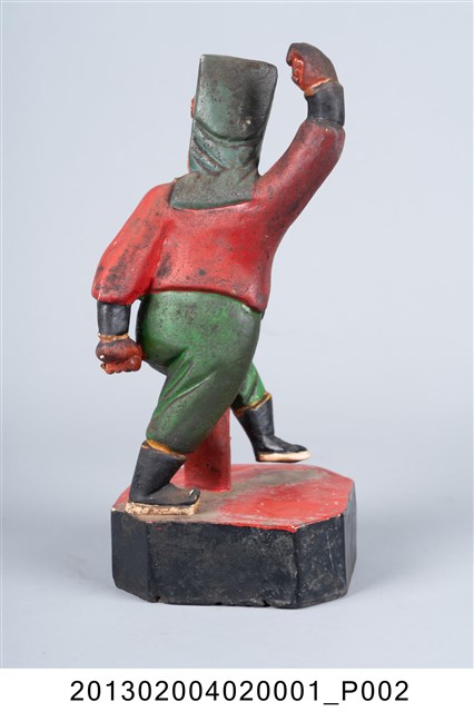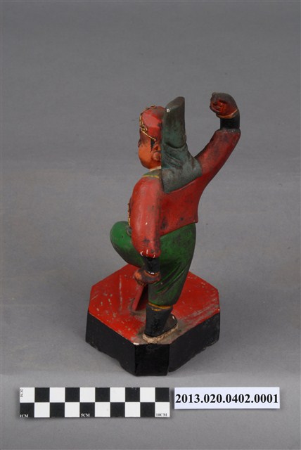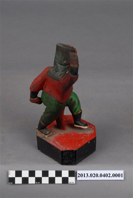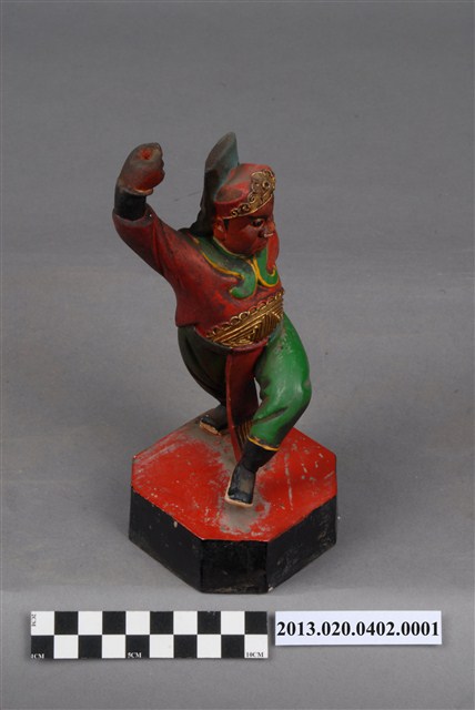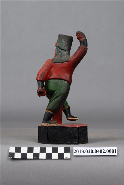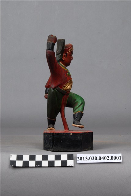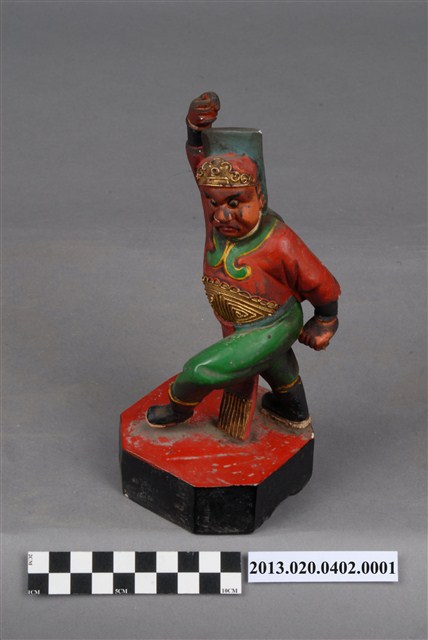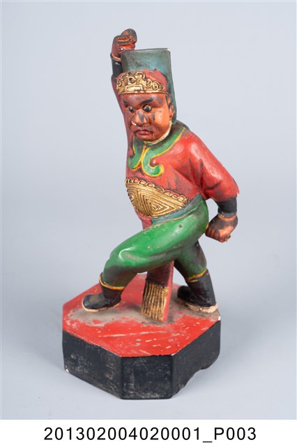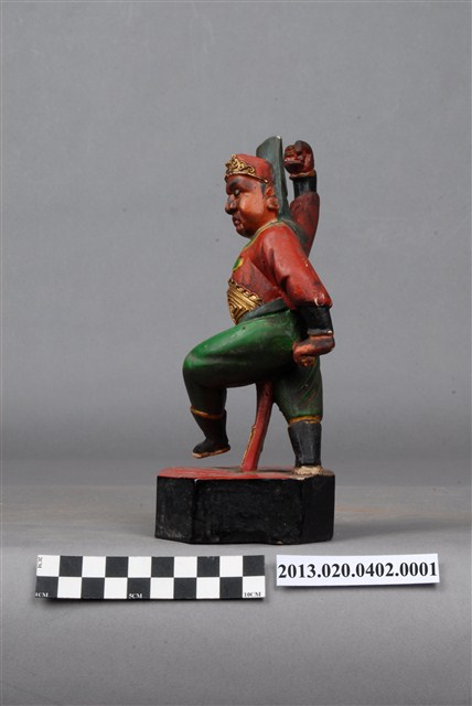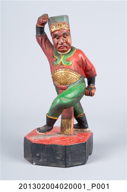神馬及馬伕的組合神像,常見於主祀王爺或關聖帝君的廟宇,一般以陪祀神的角色供奉於偏側。本件木雕像之馬伕作差役造型,右手高舉持馬繩牽引神馬,基座並無相連。惟兩神像間繩子聯繫,故視為一件。