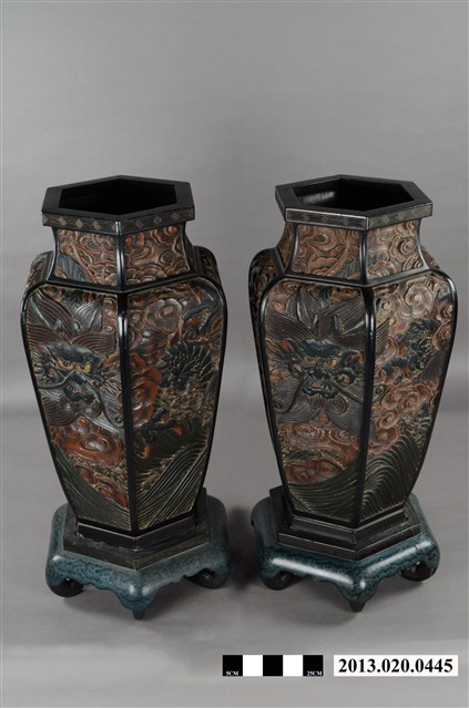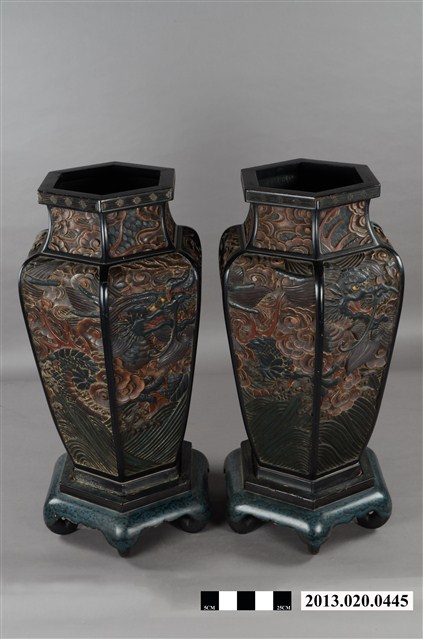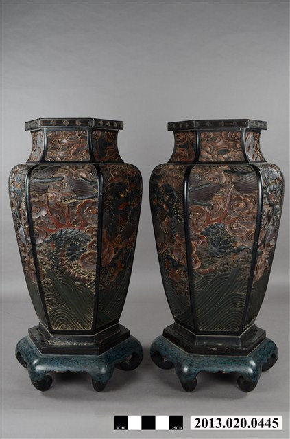 此對花瓶瓶身作六面體,短頸斜肩、斂腹、口沿平折。瓶頸作流雲飾,瓶身作雲龍主題紋飾,底部以水波紋鋪地,為木雕漆身造作品。