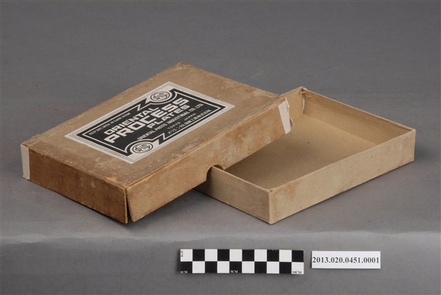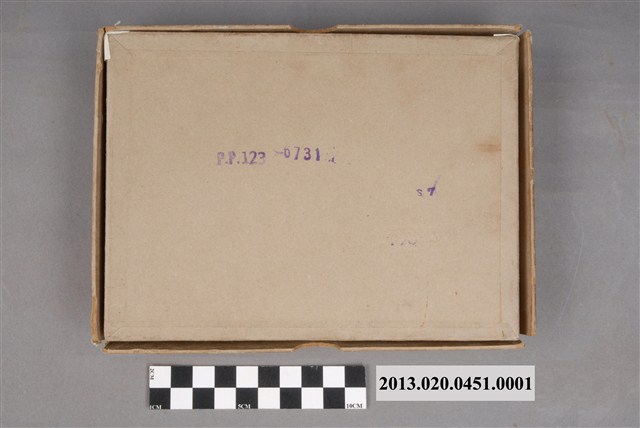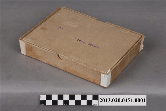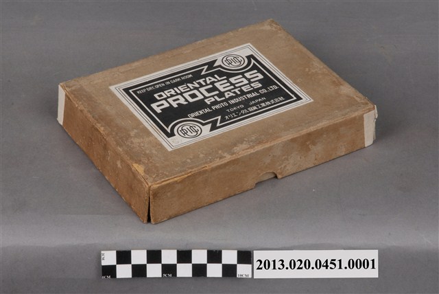 1.本件底片外盒,為硬紙板製作之長方形扁盒,分為盒蓋及盒身,上下開闔,用來存放實驗紀錄的照片及玻璃底片。盒蓋正面有一長方形標籤,右上角及左下角方印有「PIC」的商標圖,標籤左上方印有「KEEP DRY OPEN IN DARK ROOM」的說明文字;標籤中間印有「ORIENTAL PROCESS PLATES」及「ORIENTAL PHOTO INDUSTRIAL CO., LTD.」;標籤下方印有「TOKYO JAPAN」及「オリエ ンタル寫眞工業株式会社」。外盒紙板氧化泛黃,盒蓋四個邊角皆有裂開現象,其中一個邊角以白色膠帶補強,盒身右上邊角以白色膠帶補強,盒底蓋有「P.P. 123-0731」及「s7」等檔案編號標示。