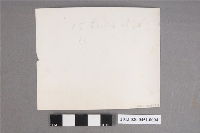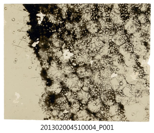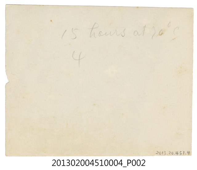植物細胞組織的顯微照片,背面有鉛筆註記字樣,「15 hours at 30 ºC」、「4」。照片尺寸通稱為4吋,沖印製作方式應該是用1:1印相的方式製作。照片上有塗抹的白色斑塊,在影像的中間、左上、左下、右邊的位置,這是因為沖洗完成的底片,上面的藥膜可能有刮傷脫落,為了避免沖洗出的照片上面會出現黑色斑點,所以用墨汁在底片上修補,因此沖洗出來的照片上會有白色的斑點。照片表面深色的部分有褪色和硫化銀的反光現象。