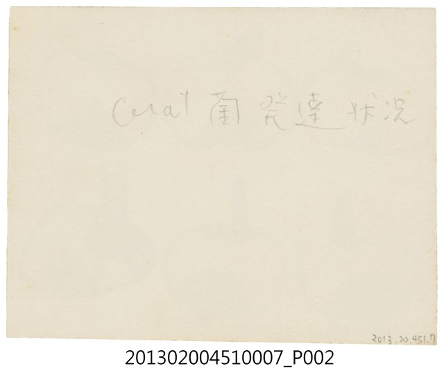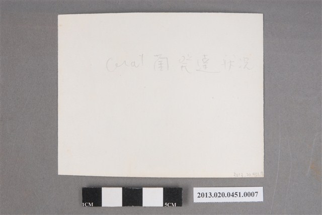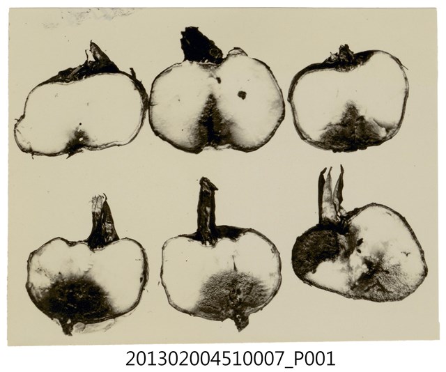 6個馬鈴薯芽切片排列的照片,因為每個標本的周邊沒有看到有修整的塗抹筆跡,所以應該是將6個切片標本直接鋪平在白色背景上,再用相機由上往下拍攝後沖印出來的照片。相片背面有註記字樣為「Cerat 菌發達狀況」,Cerat是一種角質或蠟質的細菌。照片本身經過數十年的褪色,各個主體內的一些淺色的細節可能淡化消失了,但是全體效果還是良好狀態。