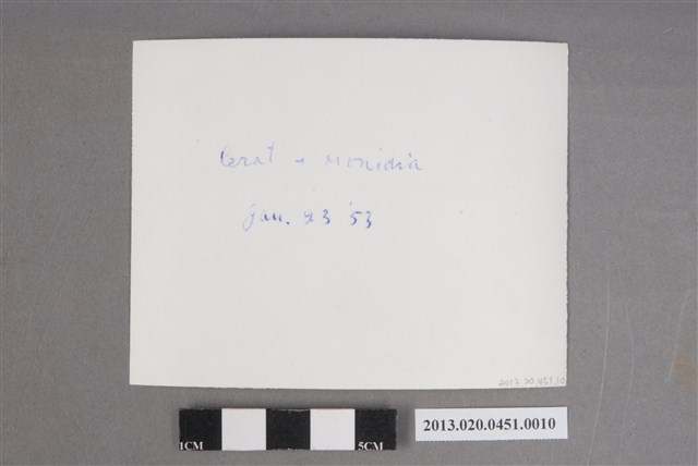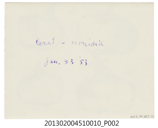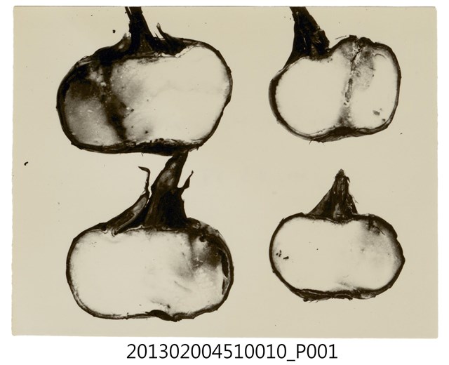 4個馬鈴薯縱向切片的樣本,並排在白色背景上面,相機由上向下拍攝後沖印所得的照片。相片背面有註記字樣為「Cerat+Monilia」、「Jan. 23‘53」,Cerat是一種角質或蠟質的細菌,Monilia是鏈珠菌。物體周圍會有很明顯的邊緣是因為拍攝時使用高反差的石版底片,沖印出來的效果就是黑白分明。