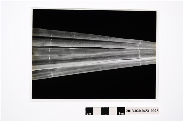1.本件底片為玻璃材質的負片,由底片調性黑白分明缺乏中間調的層次,推測是高反差「硬調」底片。2.影像拍攝主題為甘蔗病害紀錄,影像中紀錄染病蔗葉的葉片中段部分,葉片上有大小不一的駁斑,兩端有深色線條標記。3.甘蔗有葉燒病、葉枯病、白條病等等十多種常見病害,甘蔗病害會導致甘蔗產量減少、造成含糖量大幅降低,直接影響經濟效益。4.甘蔗屬禾本科、甘蔗屬,臺灣氣候適合甘蔗生長,自17世紀的荷蘭統治時期起,臺灣便大量種植甘蔗為原料來生產蔗糖,作為臺灣主要的出口商品,故甘蔗為早期臺灣最重要的經濟作物之一,直到1960年代食糖出口比重降低,臺灣逐漸從昔日的出口地區轉變為進口地區。