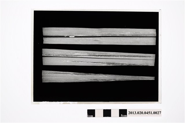 1.本件底片為玻璃材質的負片,由底片調性黑白分明缺乏中間調的層次,推測是高反差「硬調」底片。2.影像拍攝主題為甘蔗病害紀錄,影像中紀錄三片染病蔗葉,葉片上有數條淺色條狀病斑。3.甘蔗有葉燒病、葉枯病、白條病等等十多種常見病害,甘蔗病害會導致甘蔗產量減少、造成含糖量大幅降低,直接影響經濟效益。4..臺灣氣候適合甘蔗生長,自17世紀的荷蘭統治時期起,臺灣便大量種植甘蔗為原料來生產蔗糖,作為臺灣主要的出口商品,故甘蔗為早期臺灣最重要的經濟作物之一,直到1960年代食糖出口比重降低,臺灣逐漸從昔日的出口地區轉變為進口地區。