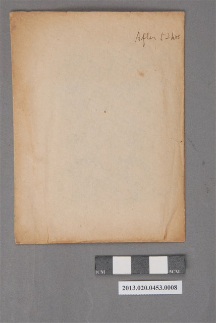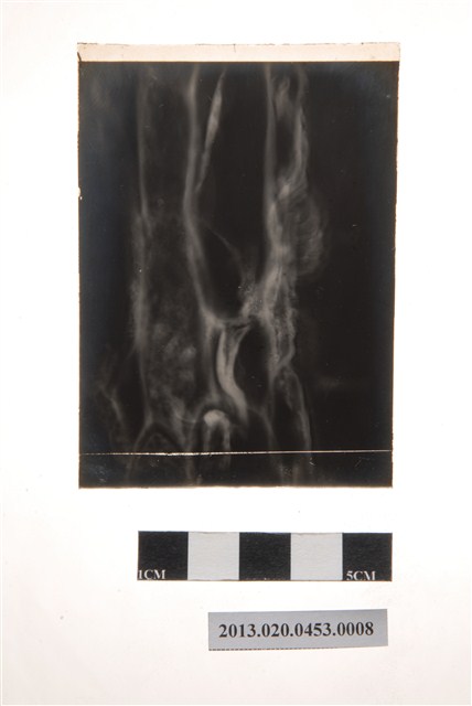 1.本件底片為玻璃材質的負片,玻版四周有硫化銀的銀色反光及邊緣藥膜縮收現象。底片一側有一條直線,推測是底片片匣內的支撐構造,防止底片脫落。2.影像拍攝主題為實驗觀察紀錄52小時後之分生孢子盤中孢子生長分佈情形的顯微影像。3.本件底片原屬國立臺灣大學之農學院所藏,國立臺灣大學前身為1928年日治時期創立的「臺北帝國大學」,成立之初日本人僅將其定位為醫學和農學的實業大學,之後才改變辦學方針而成為綜合大學。1945年中華民國政府接收臺灣後經改制與兩次易名始用現名。