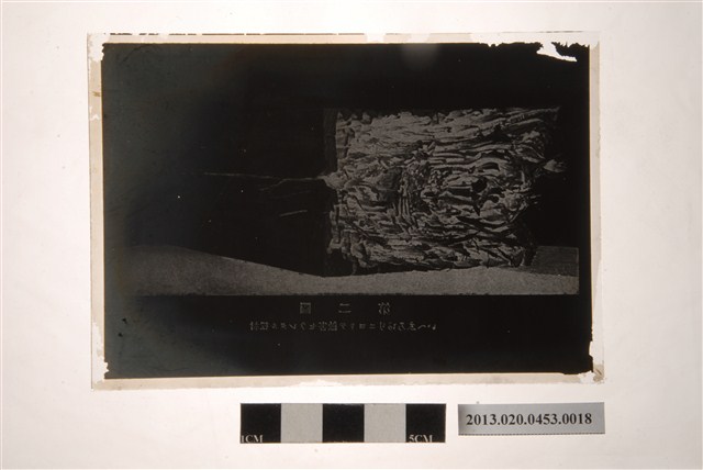 1.本件底片為玻璃材質的負片,玻版曝光過度,四周有氧化的污漬及邊緣藥膜縮收現象。影像內容為書頁翻拍。2.該底片影像有一截有橫放的長條形松材,靠近鏡頭的木材切面佈滿遭白蟻蛀蝕的痕跡,底片下方印有「第二圖」及「いへ志ろありニヨリテ蝕害セラレタル松材」等中日文說明。3.日治時期,臺灣總督府所建設的公共建築與官舍在不到10年之間受到白蟻嚴重的侵襲,引發臺灣白蟻研究的風潮,甚至帶動日本本土白蟻蟲害防治的研究。4.本件底片原屬國立臺灣大學之農學院所藏,國立臺灣大學前身為1928年日治時期創立的「臺北帝國大學」,成立之初日本人僅將其定位為醫學和農學的實業大學,之後才改變辦學方針而成為綜合大學。1945年中華民國政府接收臺灣後經改制與兩次易名始用現名。