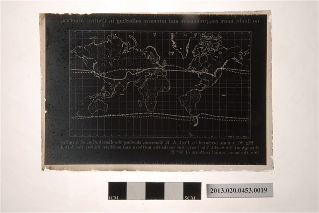 1.本件底片為玻璃材質的負片,玻版四周有硫化銀的銀色反光及邊緣藥膜縮收現象。在藥膜面有水滴狀汙漬。影像內容為分布圖翻拍。2.底片影像為A. E. Emerson教授繪製的世界白蟻分布圖,圖中有世界五大洲,四條橫線左右貫穿地圖,粗線代表白蟻分佈地區的界限,虛線則是華氏50度年均溫線,分佈圖上下方印有英文解釋說明。3.日治時期,臺灣總督府所建設的公共建築與官舍在不到10年之間受到白蟻嚴重的侵襲,引發臺灣白蟻研究的風潮,甚至帶動日本本土白蟻蟲害防治的研究。4.本件底片原屬國立臺灣大學之農學院所藏,國立臺灣大學前身為1928年日治時期創立的「臺北帝國大學」,成立之初日本人僅將其定位為醫學和農學的實業大學,之後才改變辦學方針而成為綜合大學。1945年中華民國政府接收臺灣後經改制與兩次易名始用現名。