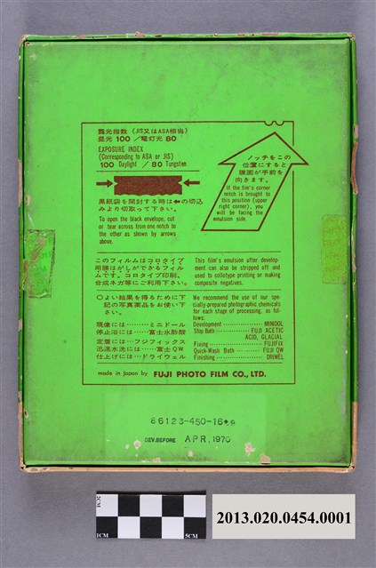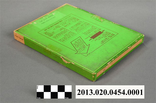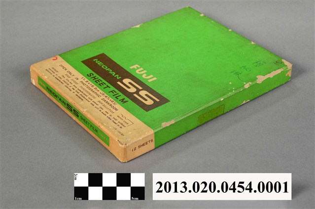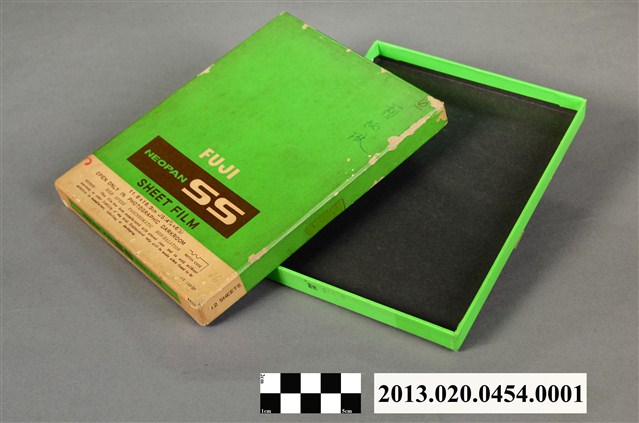 1.本件日本富士公司NEOPAN SS片裝底片的包裝外盒,是紙製之青綠色長方形扁盒,分為盒蓋及盒身,上下開闔,主要用來存放賴炳琳的實驗紀錄底片及照片,盒子內部為黑色,以防止盒子透光。盒蓋正面中間偏下部印有「FUJI」、「NEOPAN SS」及「SHEET FILM」等製造商及商品名稱,盒蓋下部有一白色區塊標註使用方式及注意事項的英文說明;盒底則以英日文詳細記載底片的種類、型號、使用方法以、沖洗方式、產地及製造公司,標示有效期限 APR . 1970。盒蓋邊角有磨損痕跡,盒蓋正面右上部用藍筆直式書寫「賴炳琳」三字。2.富士軟片股份有限公司,簡稱富士軟片或Fujifilm,是著名的日本精密化學製造、軟片、儲存媒體和相機生產商。「NEOPAN SS」為富士公司感光度ISO 100黑白單片型底片。3.賴炳琳,1972年國立臺灣大學植物病蟲害研究所碩士畢業生,指導教授陳其昌、吳龍溪,其碩士論文題目為「白絹病菌菌核形成之研究」。4.本件包裝外盒原藏於國立臺灣大學之農學院,國立臺灣大學前身為1928年日治時期創立的「臺北帝國大學」,成立之初日本人僅將其定位為醫學和農學的實業大學,之後才改變辦學方針而成為綜合大學。1945年中華民國政府接收臺灣後經改制與兩次易名始用現名。