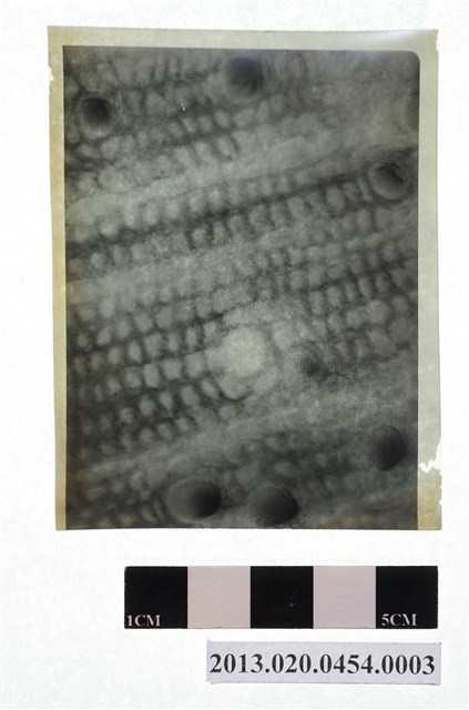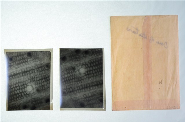 1.本件底片為膠片材質,記錄植物病害組織之顯微黑白影像。植物及病害種類不詳。保存該底片的紙袋正面有「One of the two」黑色字跡,背面有「 1, 2」黑色字跡。2.底片尺寸非制式規格,可能是由大張底片裁切而來。「NEOPAN SS SHEET FILM」片裝軟片11.8cm x 16.3cm裁切成4張。每一張約為5.9cm x 8.1cm。3.本件底片原藏於國立臺灣大學之農學院,為國立臺灣大學農學院賴炳琳底片與照片組組件之一。國立臺灣大學前身為1928年日治時期創立的「臺北帝國大學」,成立之初日本人僅將其定位為醫學和農學的實業大學,之後才改變辦學方針而成為綜合大學。1945年中華民國政府接收臺灣後經改制與兩次易名始用現名。